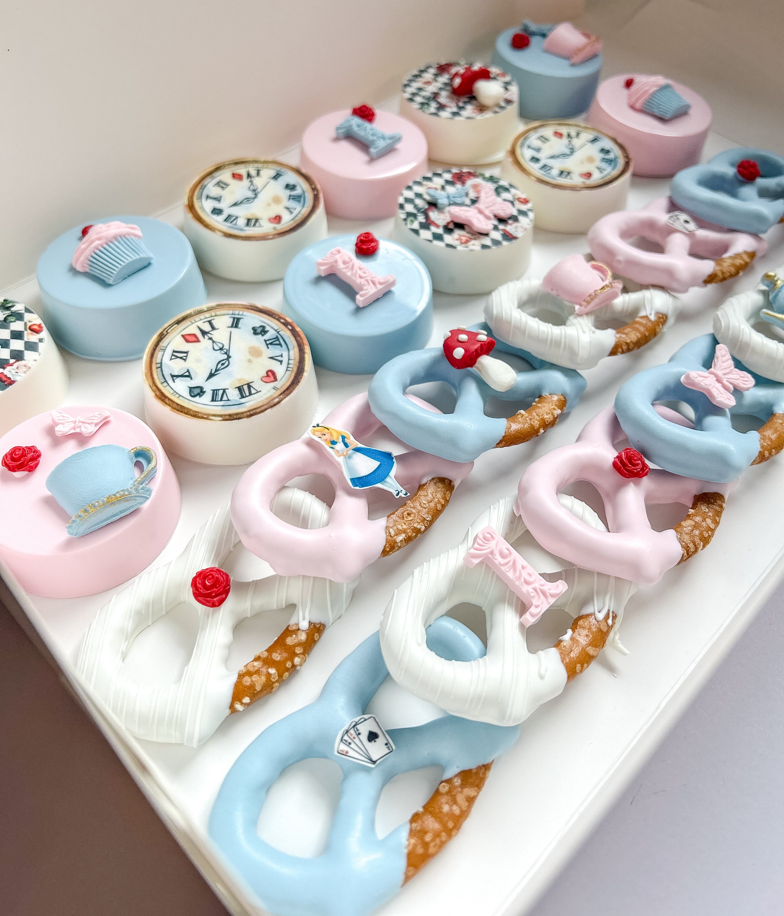 Customizable Options Include: Flavor, Colors, Shape, Sticks, Molds, Designs/Themes, Sprinkles, Luster Dust, Edible Gold, Ribbon, Packaging